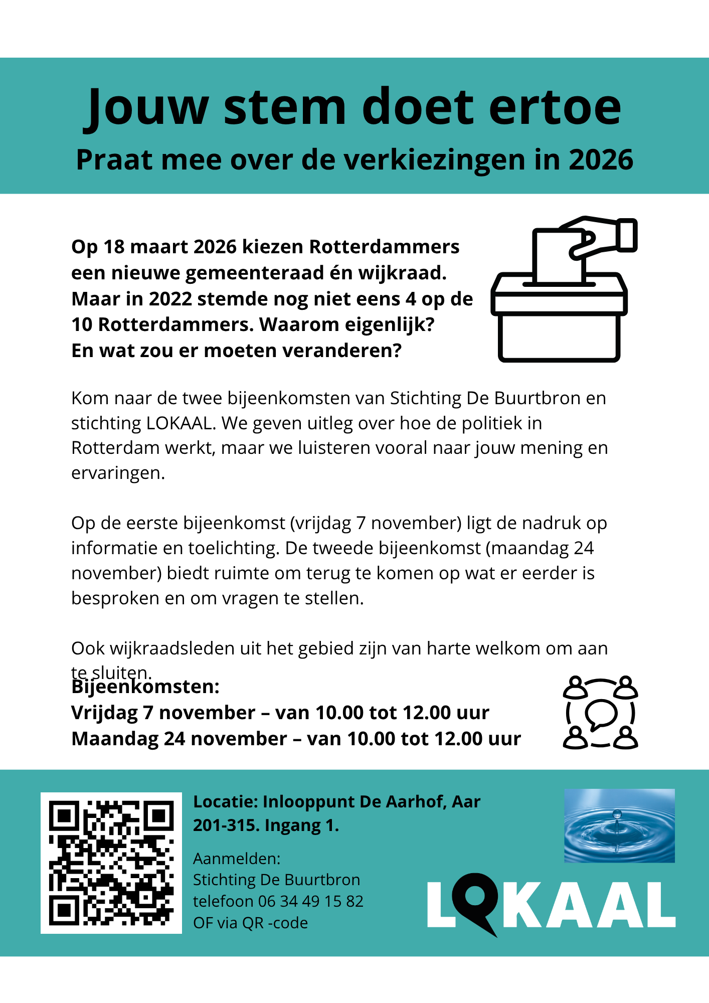 Inlooppunt De Aarhof | Aar 193 ingang 1 | in de recreatiezaal | themabijeenkomst over de Gemeenteraads- en Wijkraadsverkiezing 2026 | vrijdag 7 november van 10.00 tot 12.00 uur.