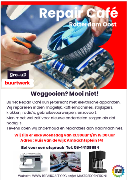 Huis van de Wijk Zevenkamp | Ambachtsplein 141 in Zevenkamp | elke woensdagmiddag is er Repaircafé | van 13.30 tot 15.30 uur | OP AFSPRAAK via telefoon 06 14 10 56 54.