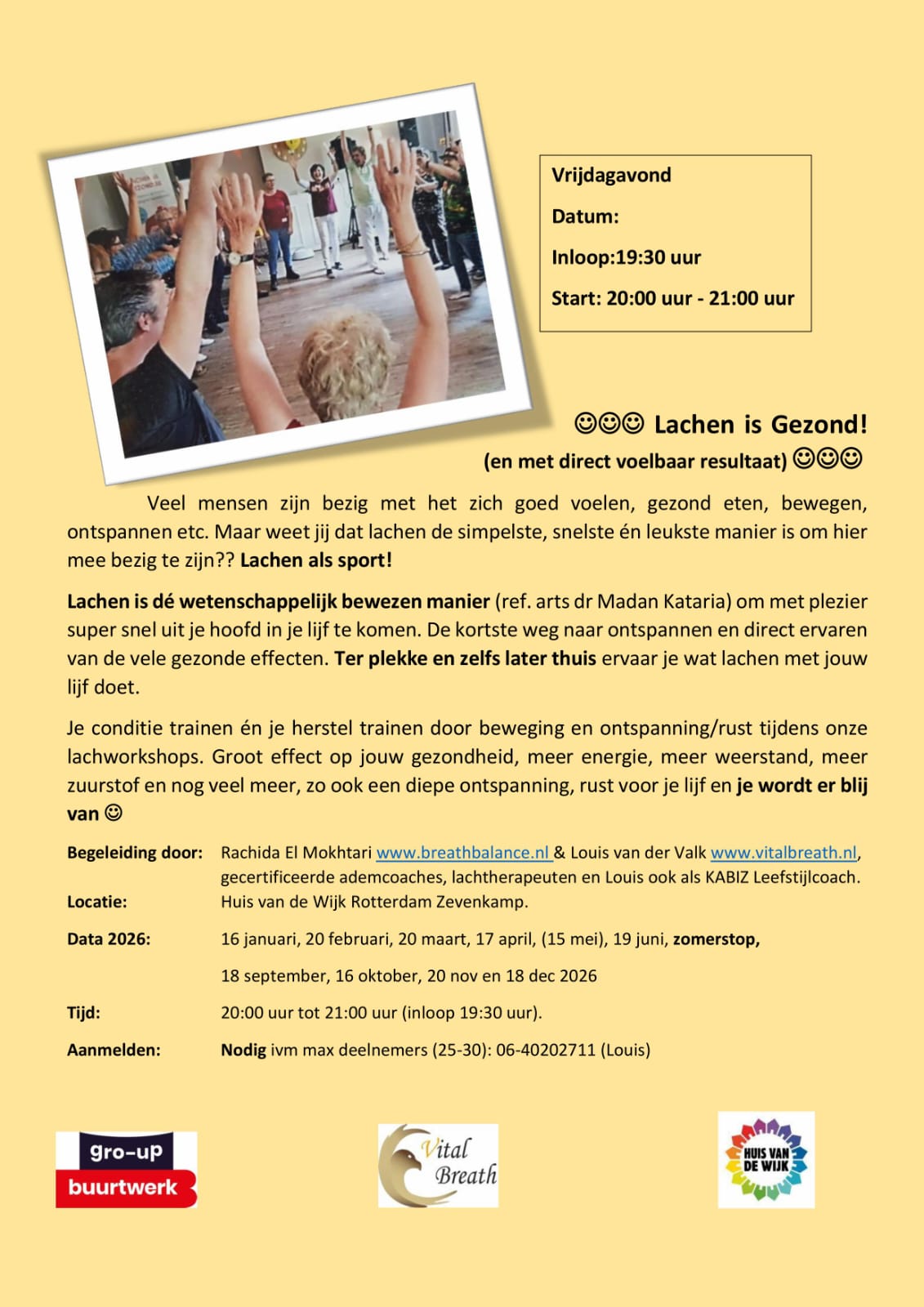 Huis van de Wijk Zevenkamp | Ambachtsplein 141 | Lachyoga op vrijdag 20 februari 2026 | Informatie en aanmelden via telefoon 06 40 20 27 11 bij Louis.