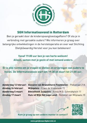 Stichting Gelijkwaardig Herstel organiseert op donderdag 5 maart (van 19.30 tot 21.00 uur) een informatieavond voor wie geraakt is door de kinderopvangtoeslagaffaire. Zie de flyer voor meer informatie